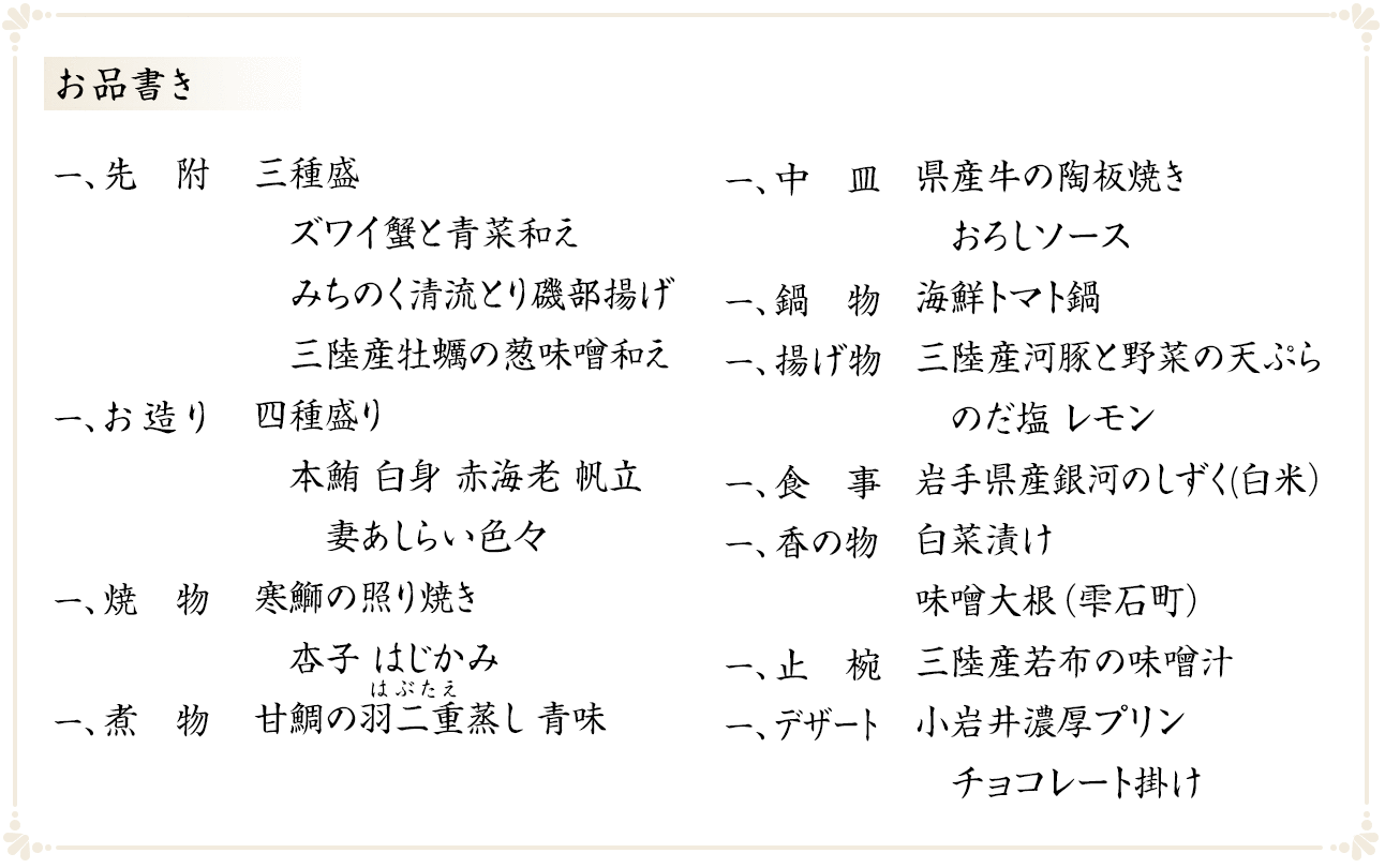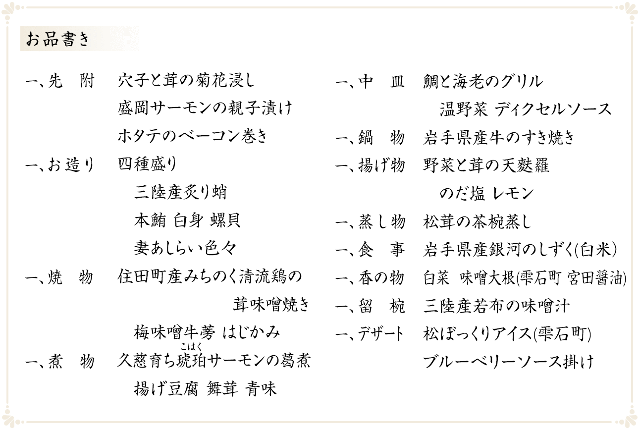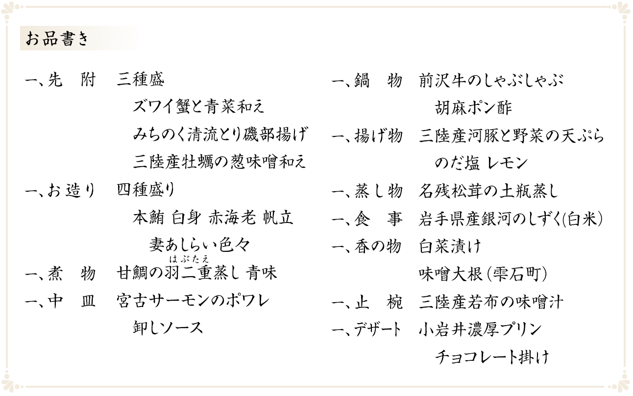 特選コースは、特選素材を活かした四季替わりのグルメコースです。岩手旅行の思い出に、また、記念日・お祝いに、自分へのご褒美に、大切な方のおもてなしにおすすめです。