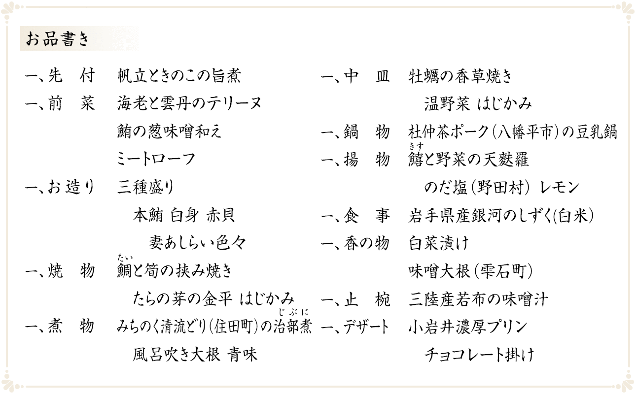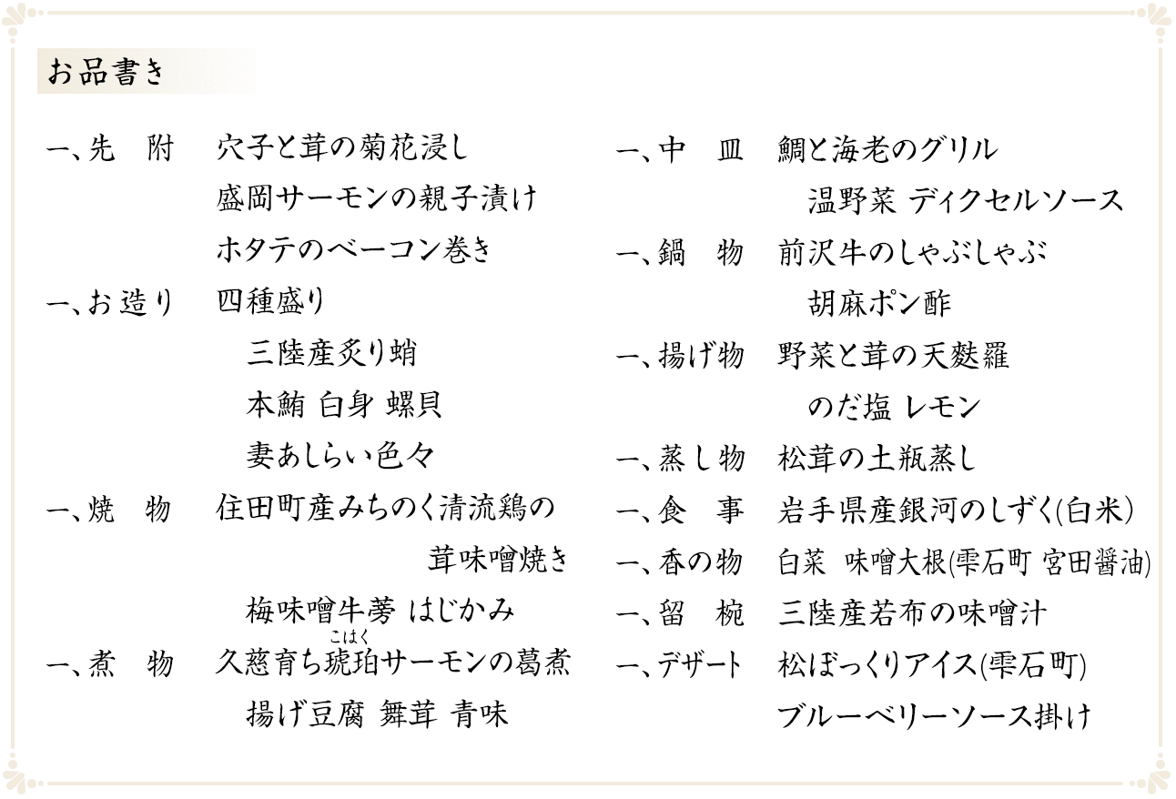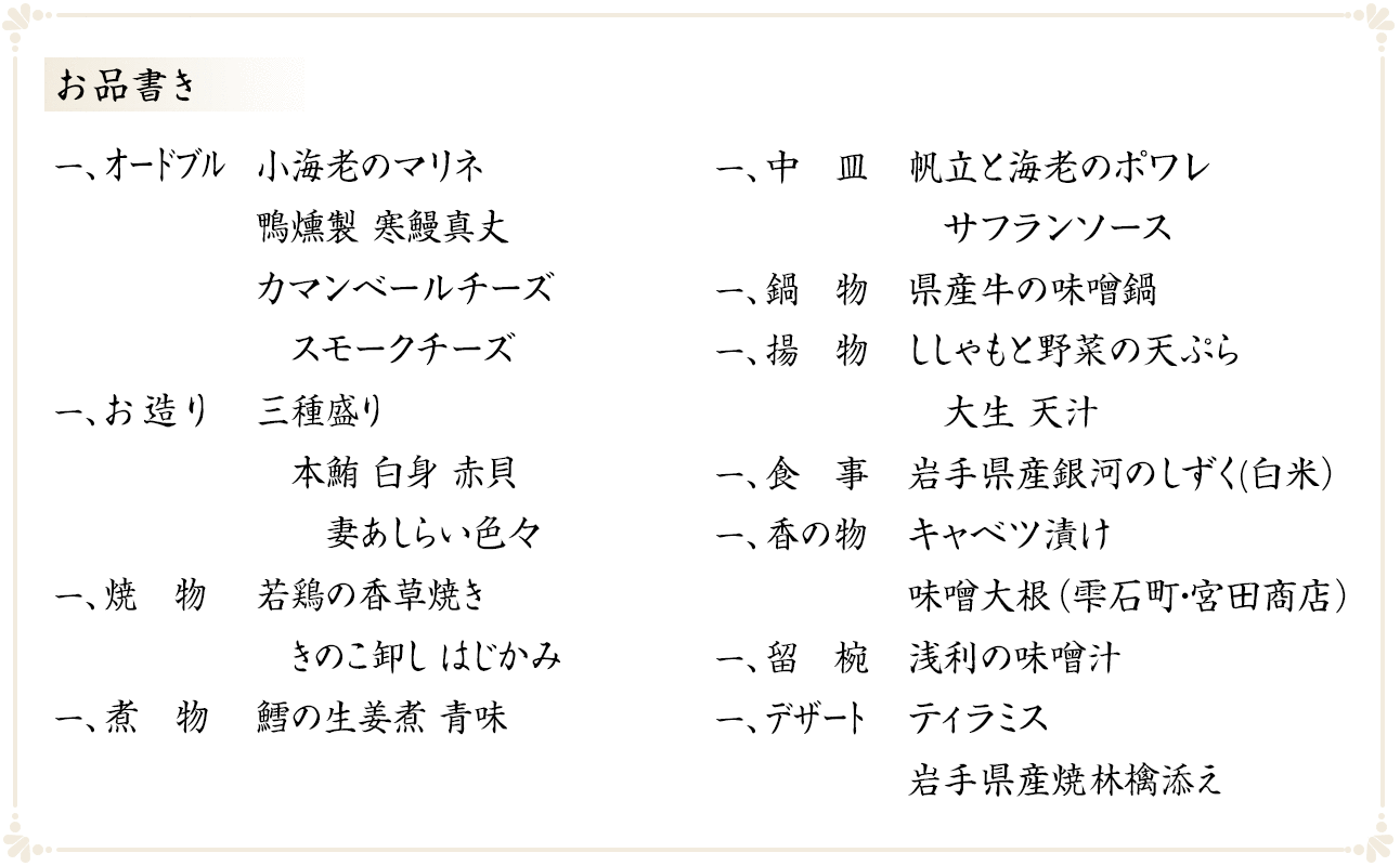 特選コースは、特選素材を活かした四季替わりのグルメコースです。岩手旅行の思い出に、また、記念日・お祝いに、自分へのご褒美に、大切な方のおもてなしにおすすめです。