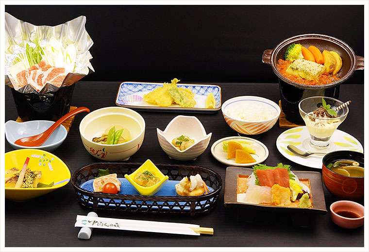 旬と地の素材を活かした、月替わりの料理コースです。大自然に抱かれた当館で、旬の味覚をごゆっくりとお楽しみください。