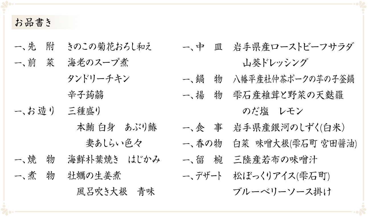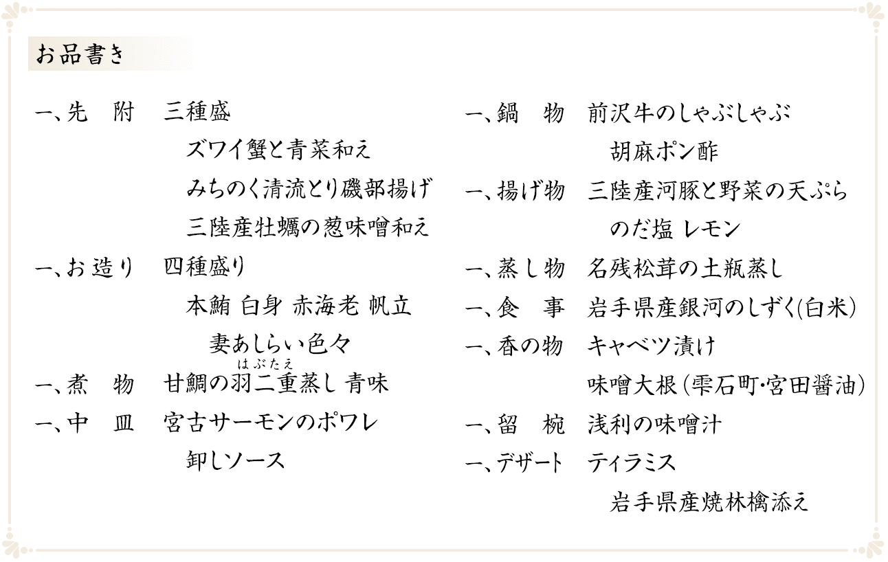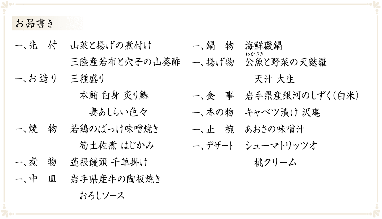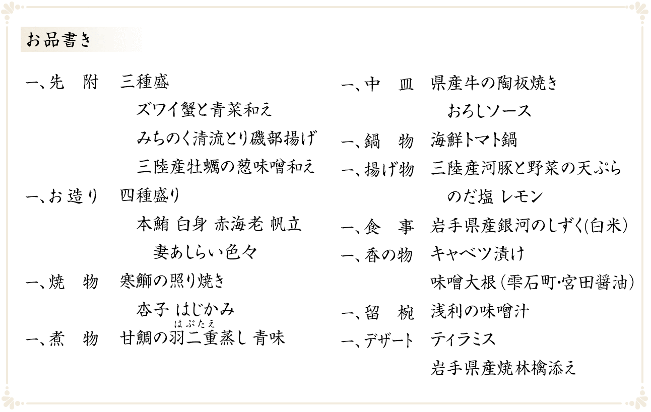 特選コースは、特選素材を活かした四季替わりのグルメコースです。岩手旅行の思い出に、また、記念日・お祝いに、自分へのご褒美に、大切な方のおもてなしにおすすめです。