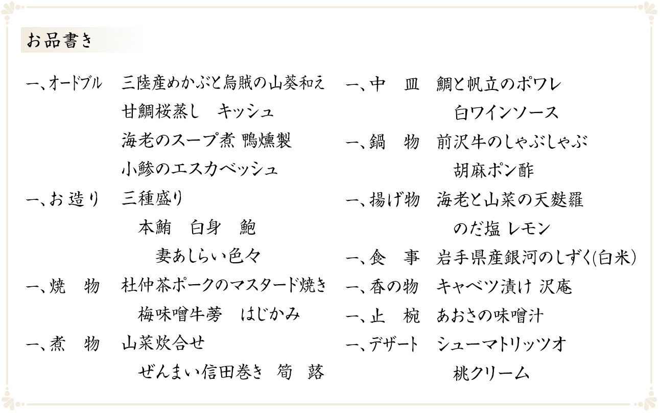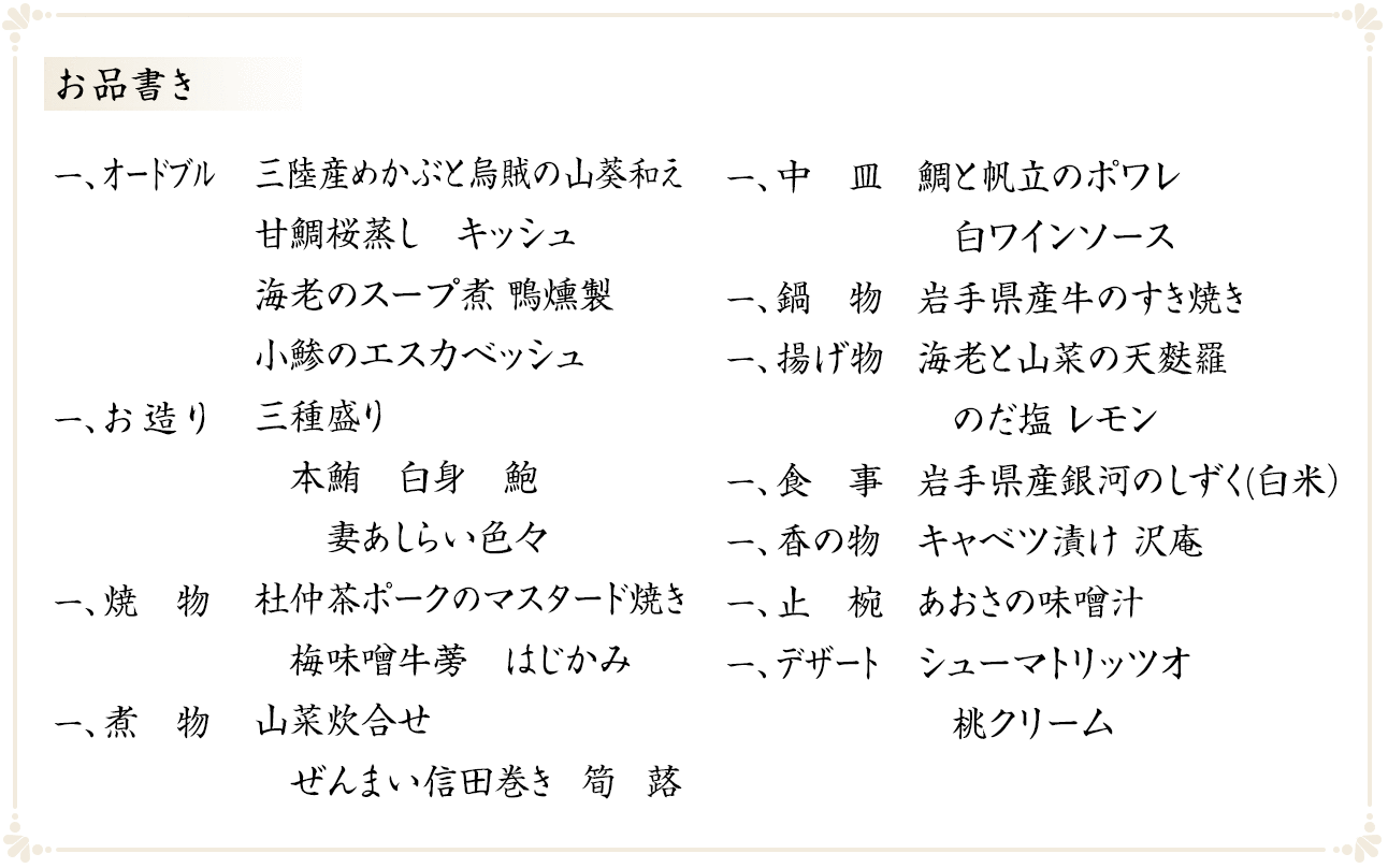 特選コースは、特選素材を活かした四季替わりのグルメコースです。岩手旅行の思い出に、また、記念日・お祝いに、自分へのご褒美に、大切な方のおもてなしにおすすめです。